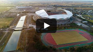 新潟市中央区の鳥屋野潟公園の中でも、特に「ビッグスワン」「エコスタジアム」、多目的広場などと共に、カナール(運河)や池などの自然と触れあえるエリアが混在する新潟県スポーツ公園を空から撮影。