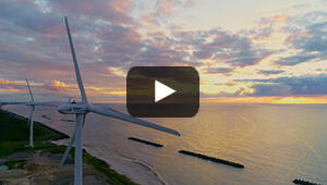 胎内市の海岸線に立ち並ぶ風力発電機。支柱の高さは60メートル、一枚の羽根の長さは39メートル。日本海の風と夕日を浴びて羽根を回す様は、威風堂々としている。