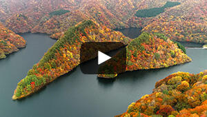 三面ダム湖に並んで浮かぶ二つの島。ブナ、モミジ、カエデなどが紅葉し荘厳な風景が広がっています。