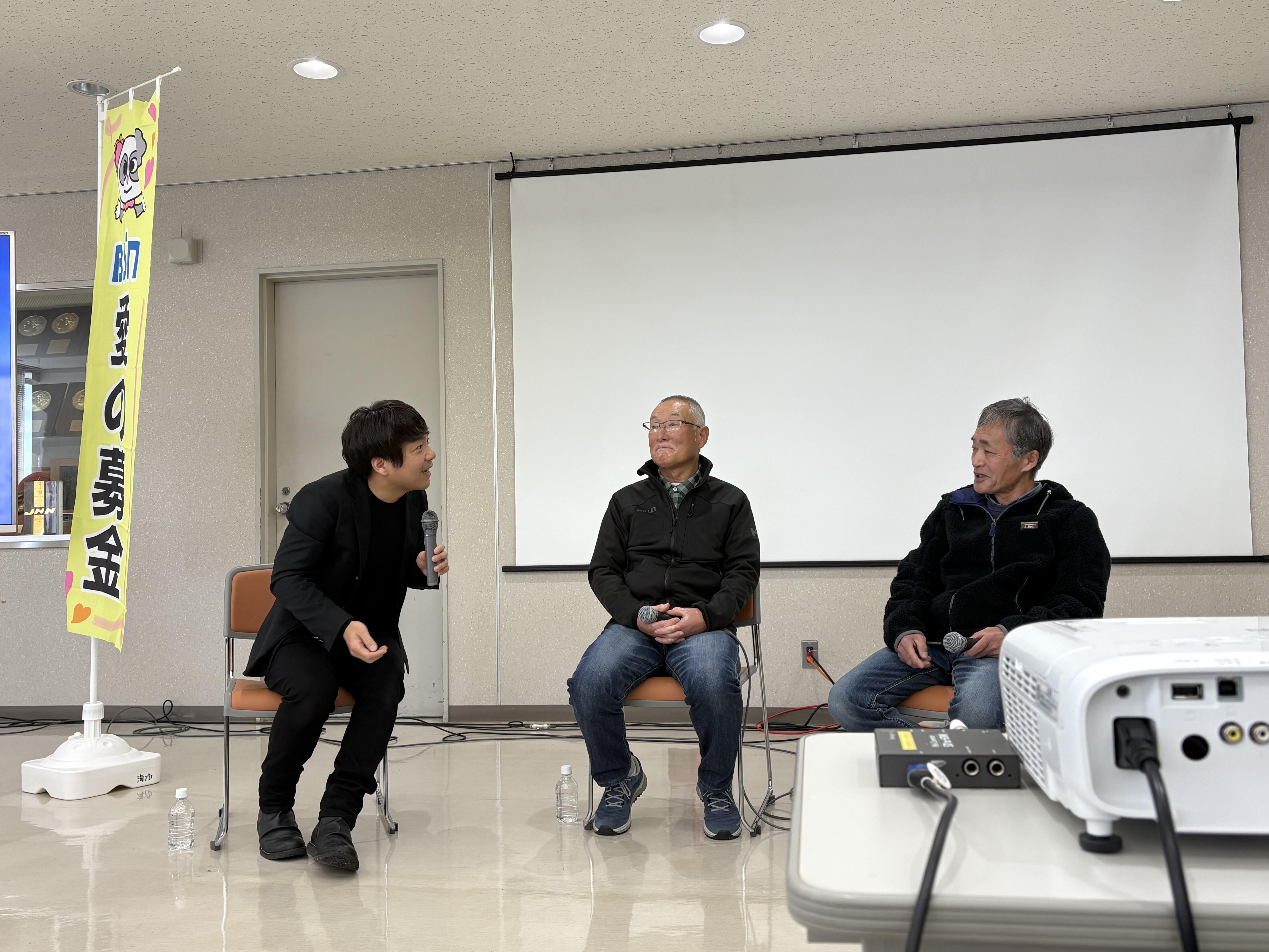 後半、取材でもお世話になった山のレジェンド、胎内北飯豊の会会長 矢沢和夫さまと、下越山岳会会長 上條力一郎さまを迎えてトークイベント。進行は、撮影・取材・ナレーションすべてをこなすカメラマン五十嵐祐でした。