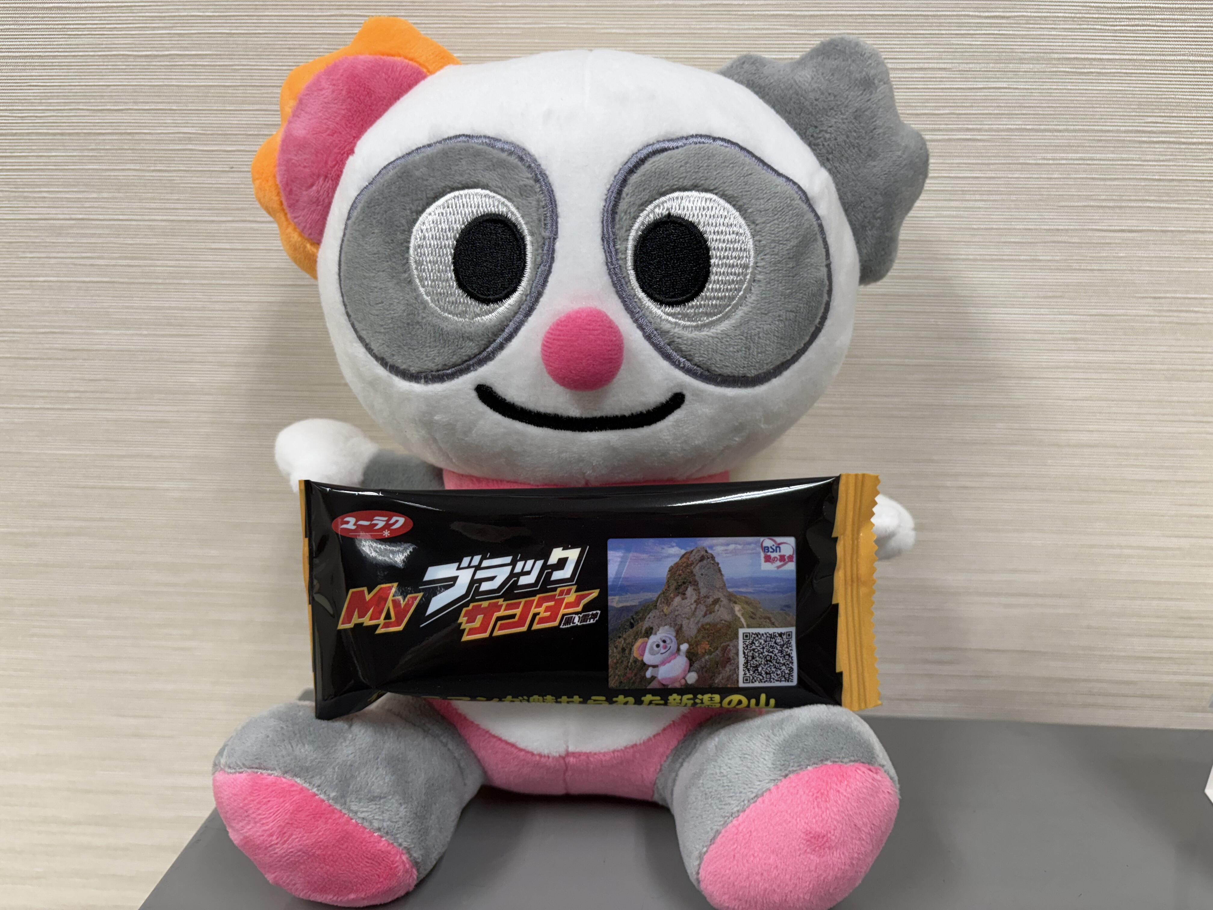 お配りしたオリジナルのお菓子。QRコードを読み取って頂くと、NEWS DIGの山の映像にリンクしています!