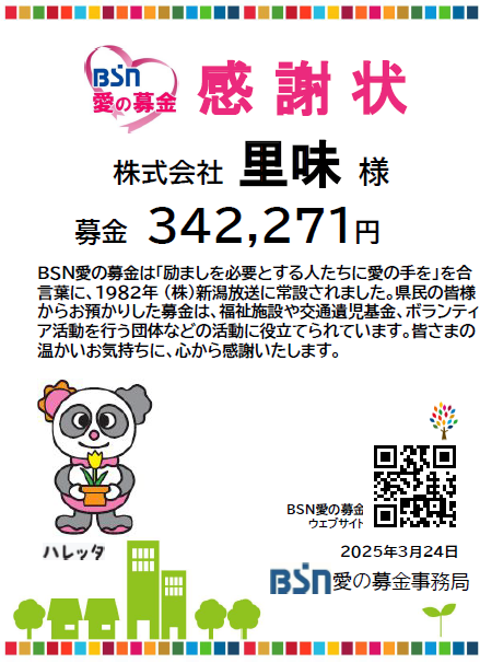 「くいどころ、里味♪」でおなじみの株式会社里味様から、今年も「BSN愛の募金」を頂戴しました。お客さま、皆さまからのお気持ちです!