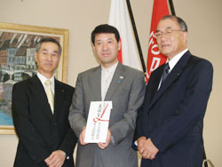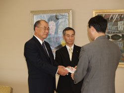 泉田裕彦知事(日本赤十字社県支部長)に義援金の目録を手渡す