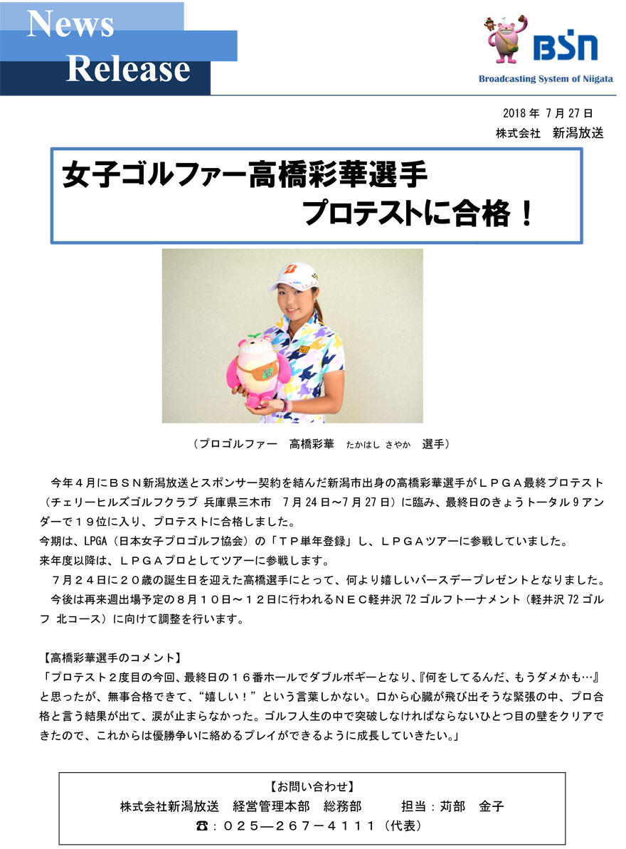 女子ゴルファー高橋彩華選手プロテストに合格!