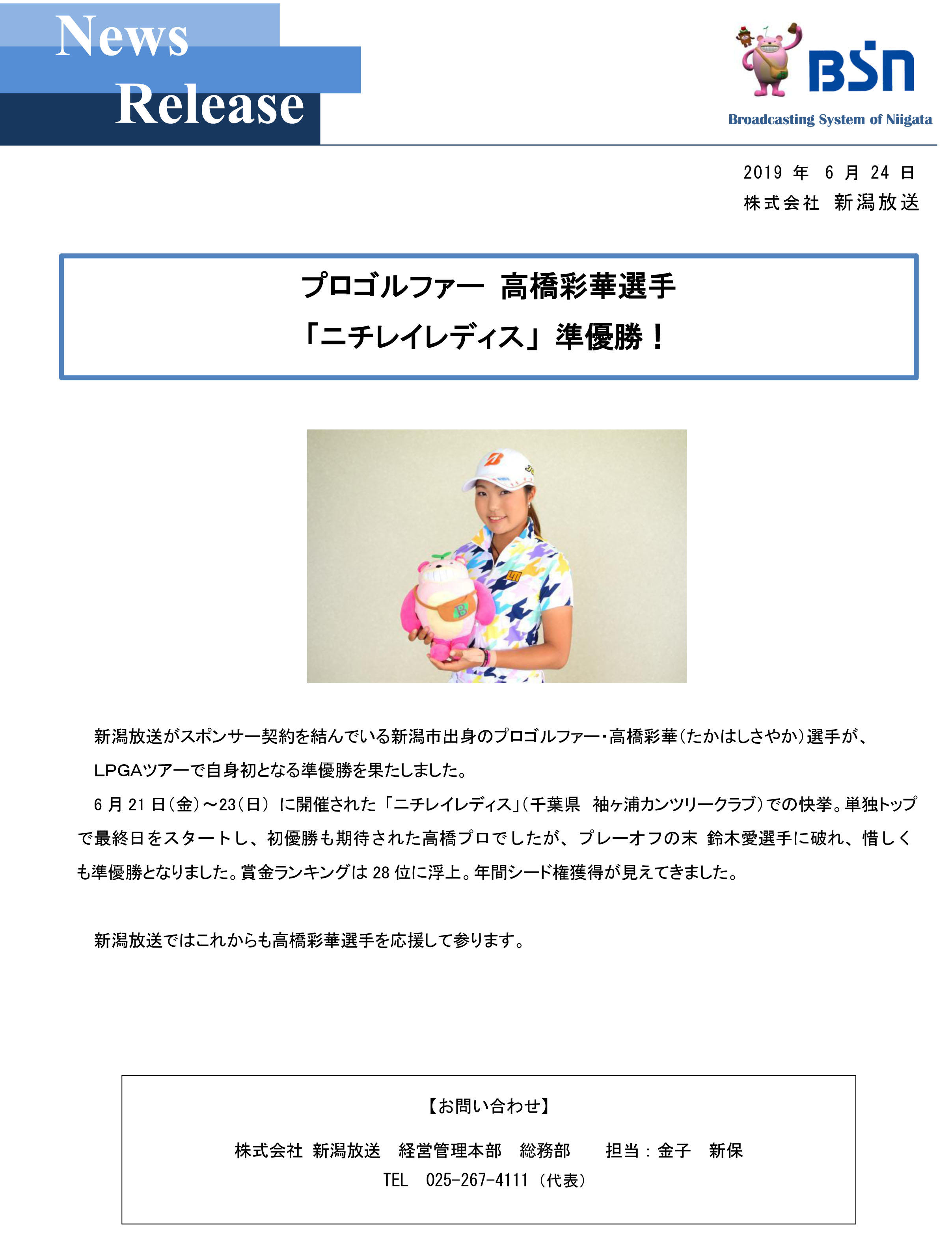 準優勝!女子プロゴルファー高橋彩華選手(新潟市出身)