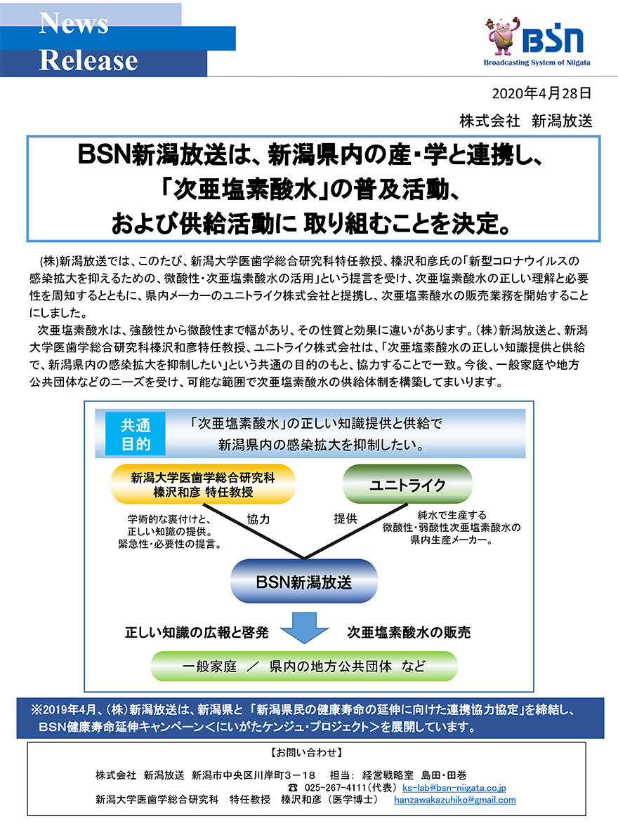BSN新潟放送は、新潟県内の産・学と連携し、「次亜塩素酸水」の普及活動、および供給活動に取り組むことを決定。