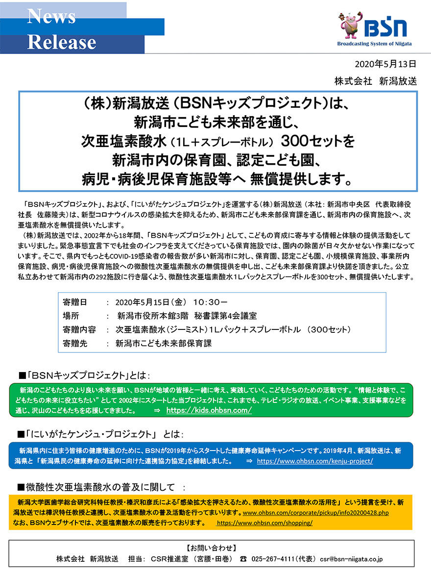 BSNキッズプロジェクト、新潟市内の保育園に次亜塩素酸水を無償提供