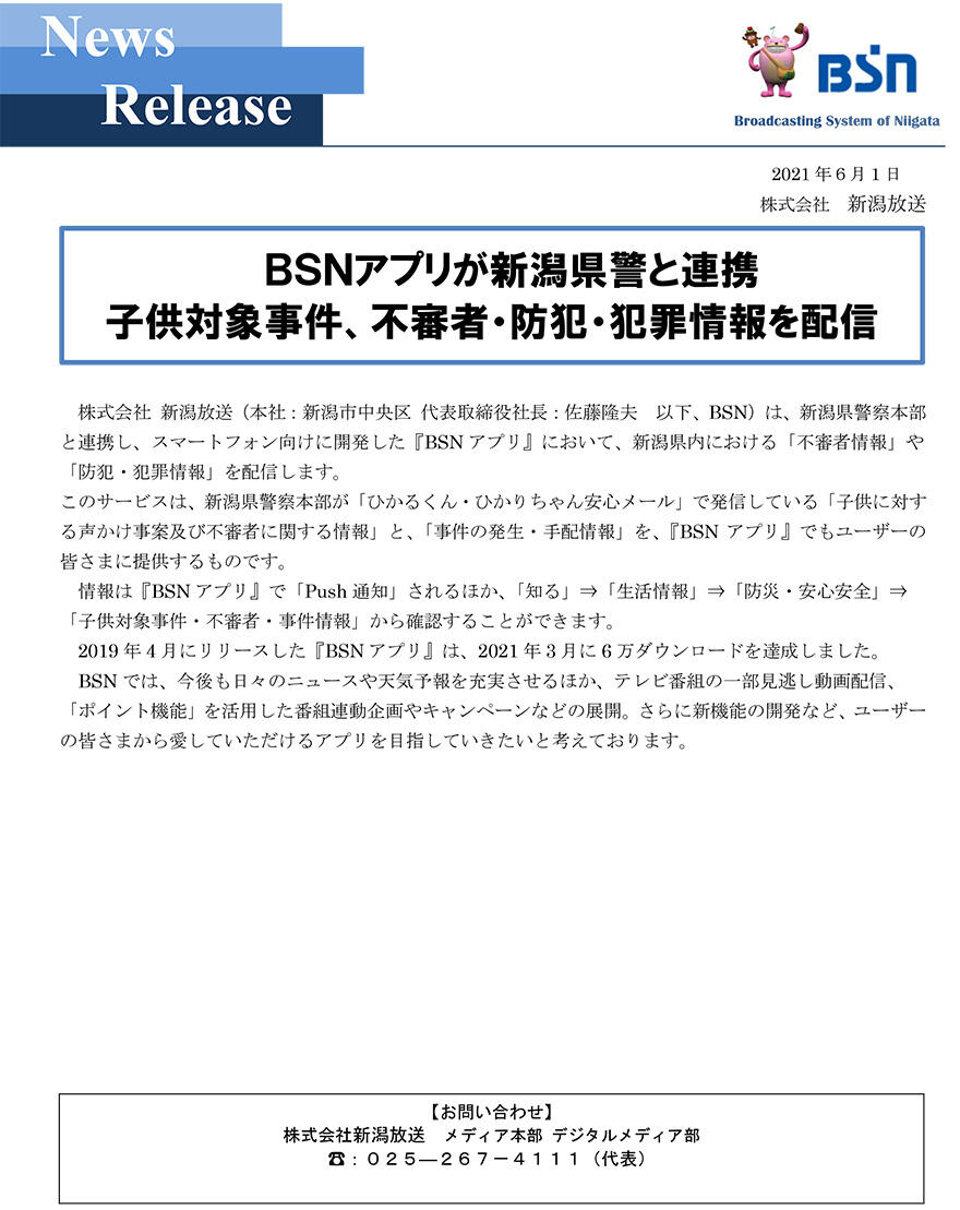BSNアプリが新潟県警と連携 子供対象事件、不審者・防犯・犯罪情報を配信