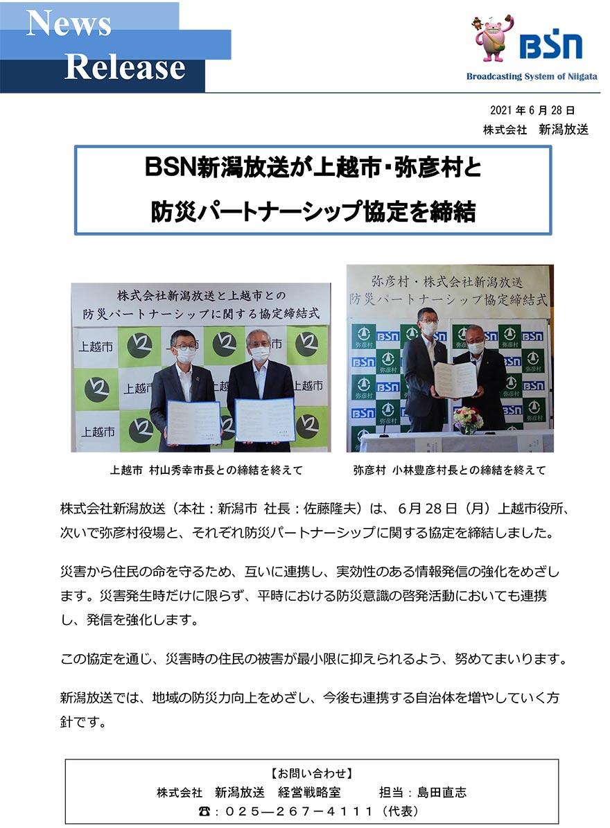 BSN新潟放送が上越市・弥彦村と防災パートナーシップ協定を締結