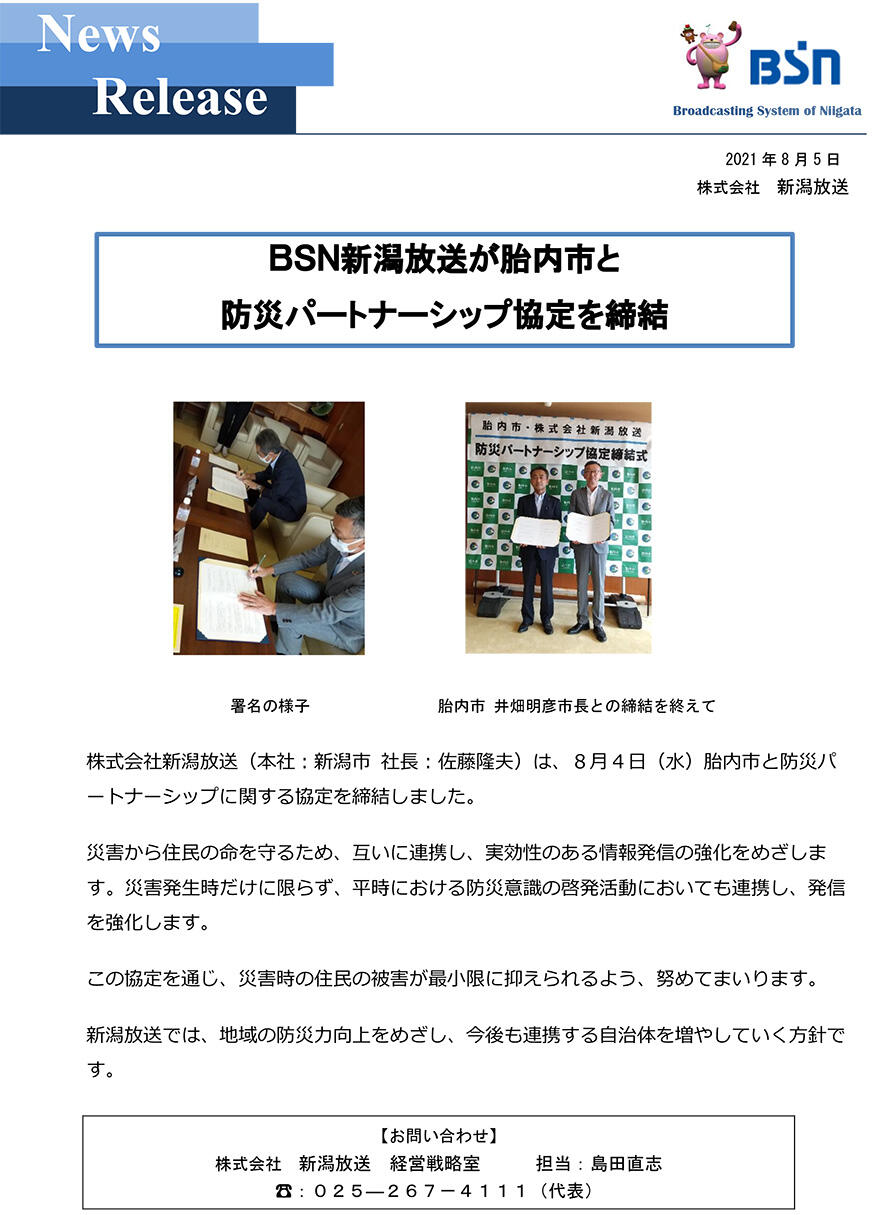 BSN新潟放送が胎内市と防災パートナーシップ協定を締結