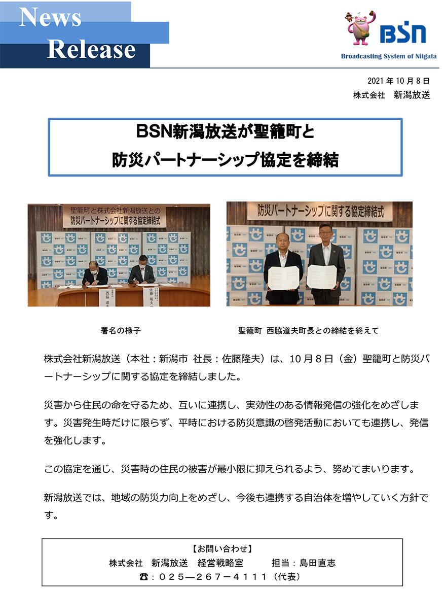 BSN新潟放送が聖籠町と防災パートナーシップ協定を締結