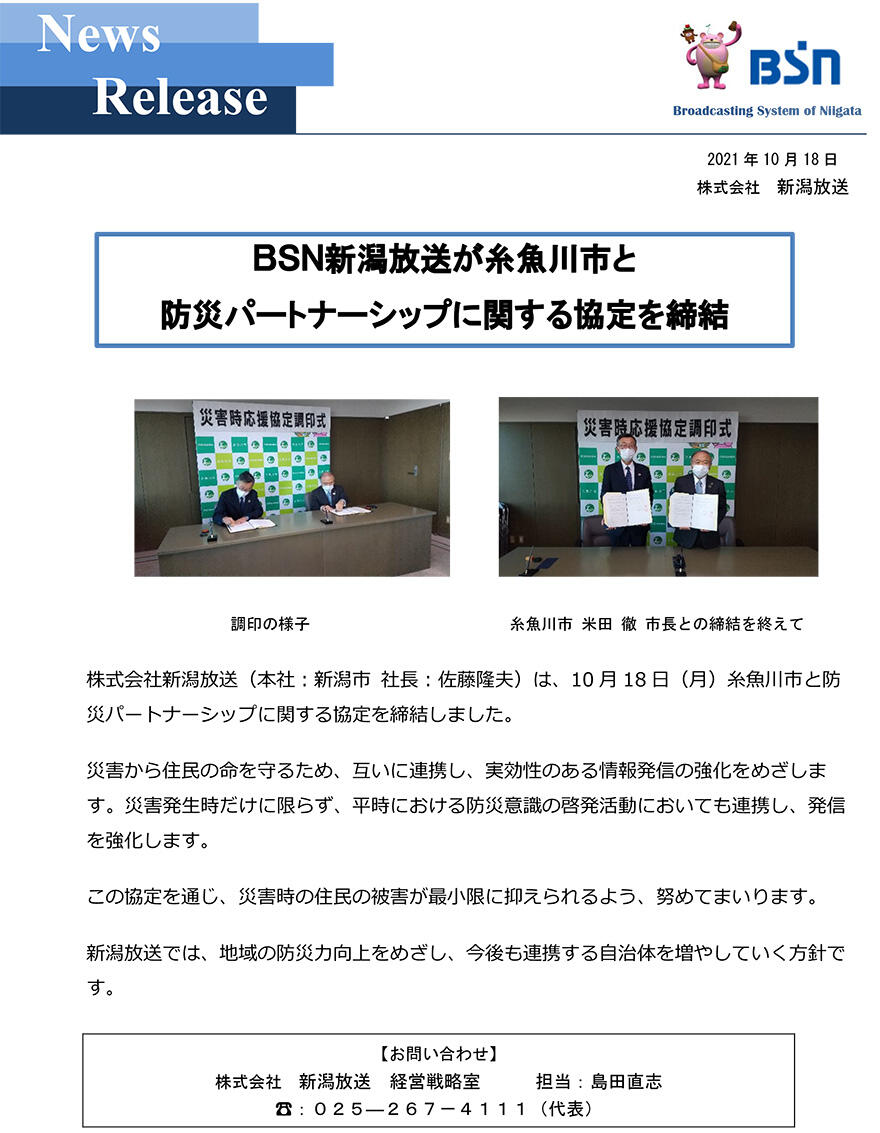 BSN新潟放送が糸魚川市と防災パートナーシップ協定を締結