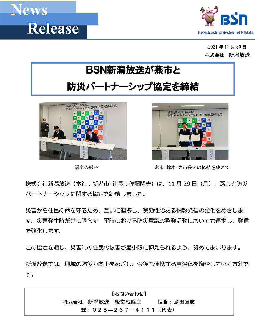 BSN新潟放送が燕市と防災パートナーシップ協定を締結