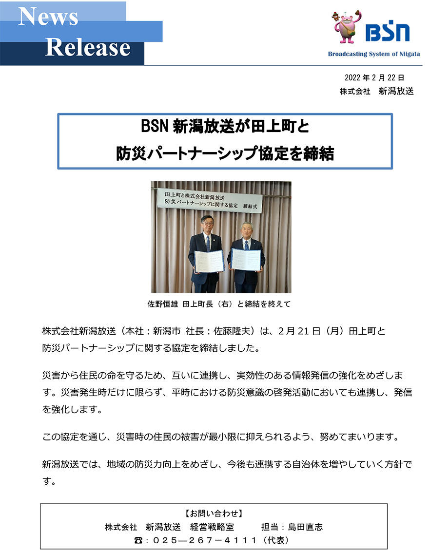 BSN新潟放送が田上町と防災パートナーシップ協定を締結