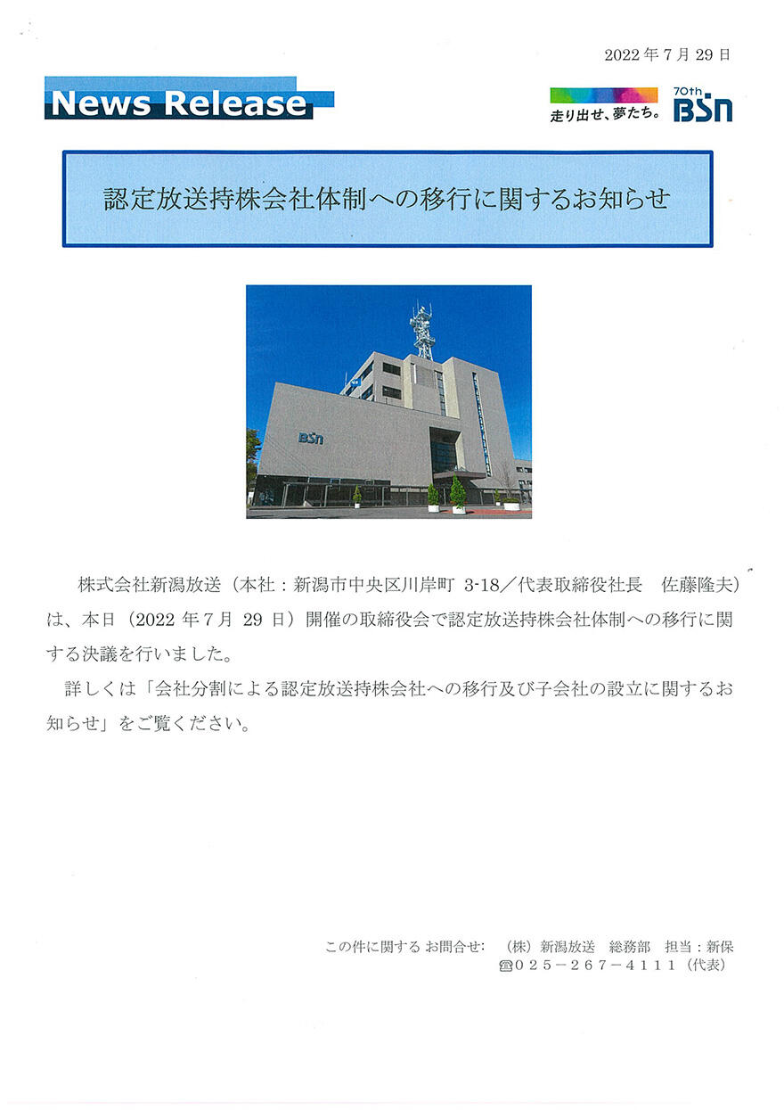 会社分割による認定放送持株会社体制への移行及び子会社の設立に関するお知らせ