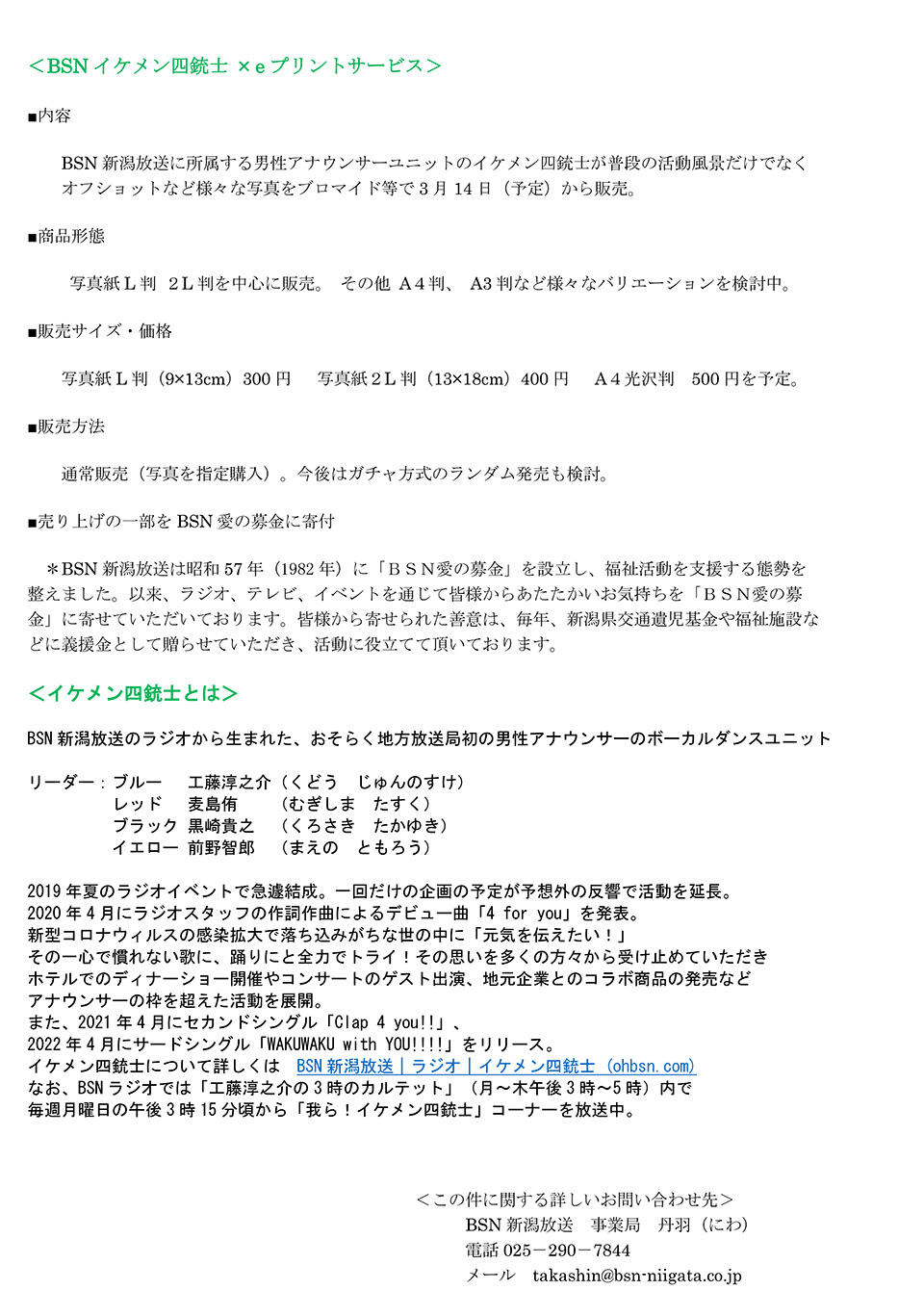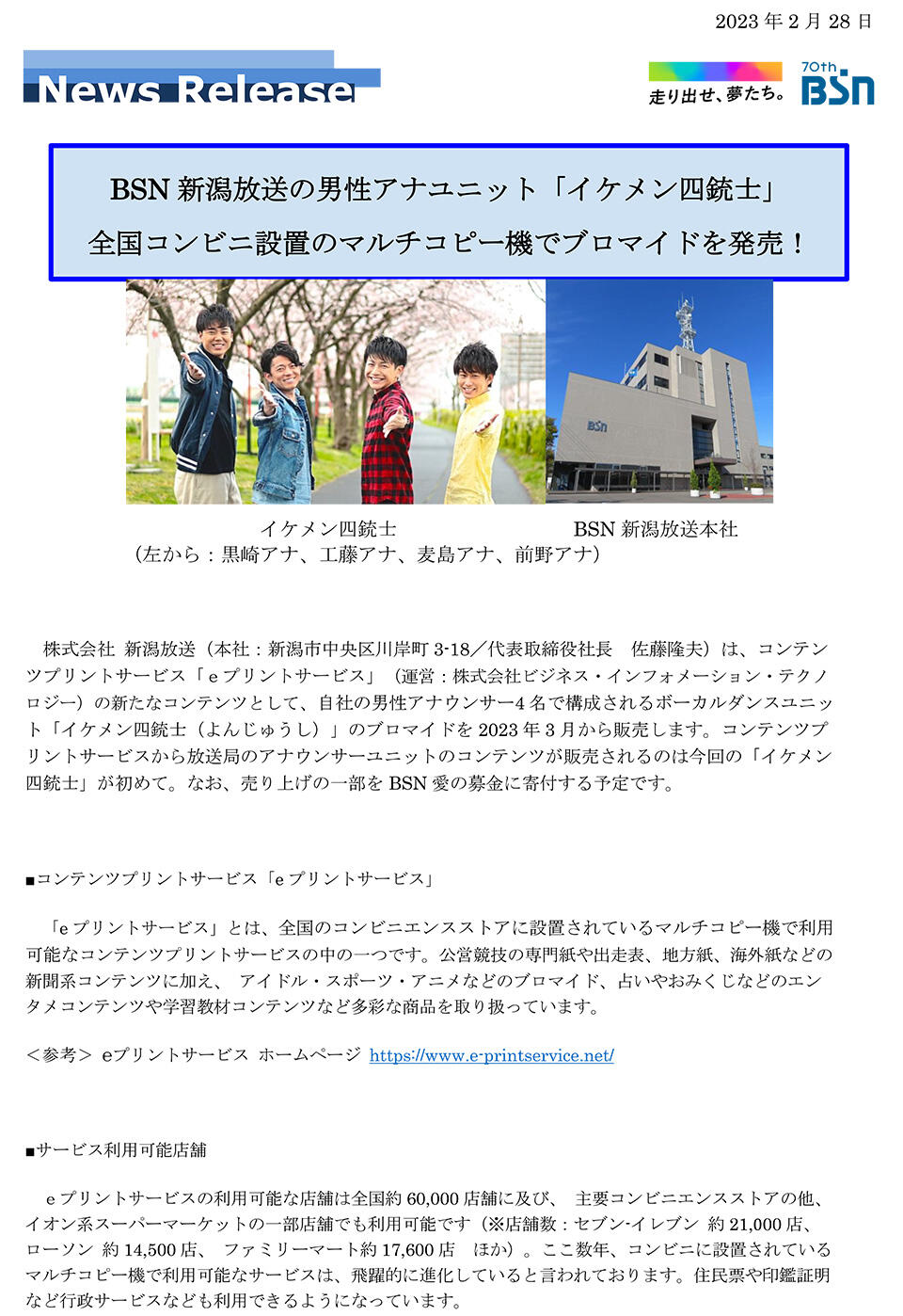 BSN新潟放送の男性アナユニット「イケメン四銃士」 全国のコンビニ設置のマルチコピー機でブロマイド等を発売!