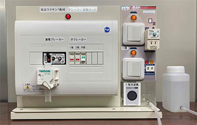 防災ワクチン®︎ の概念の元、小学生や中学生に実際にブレーカーキットを触ってもらうために、安全に考慮しかつ軽量、実物に限りなく近づけた仕様。 電気が水を通りやすいことや水害や地震を模擬することで、通電火災が発生するメカニズムを学習できます。