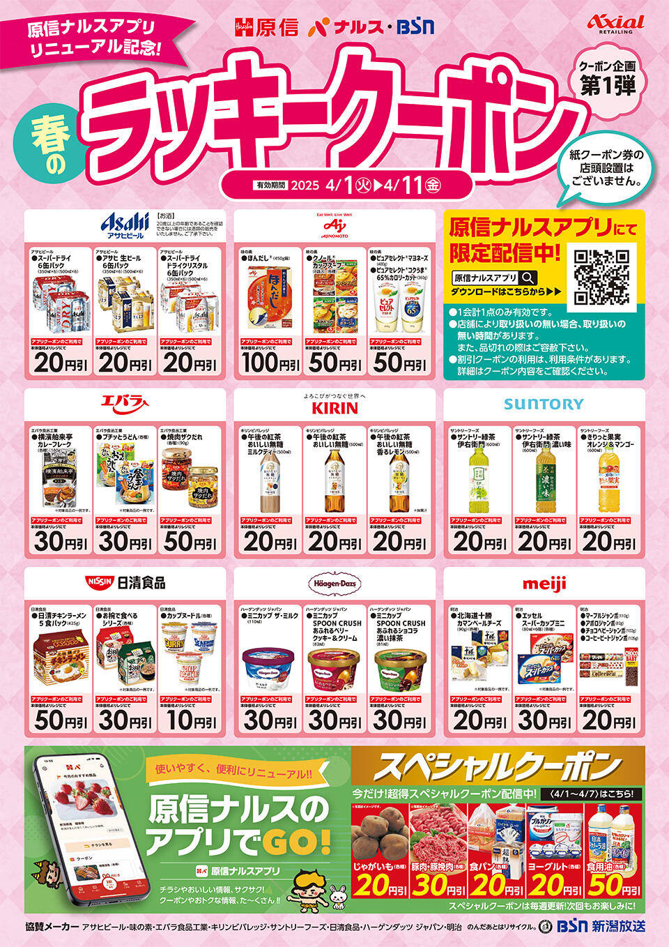 「原信ナルスアプリ」で限定配信中の割引クーポンをご提示ください。