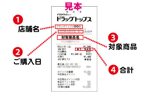 協賛各社の商品を含む1,000円以上(税込)のお買い上げレシート画像(下記参照)と必要事項を入力してご応募ください。