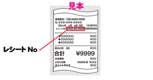 レシート番号は、レシート内の日付印字の下に記載してある4桁-2桁-4桁の番号です。