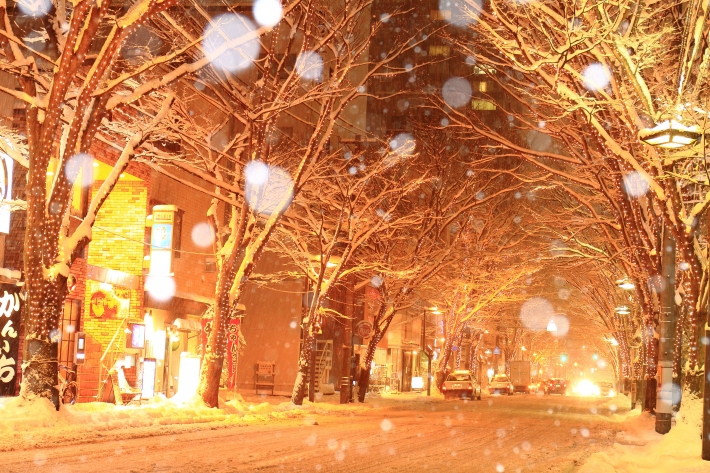 新潟駅南口のイルミネーション 雪が舞うと 東京のそれに匹敵するほどのきらめきを見せてくれます。