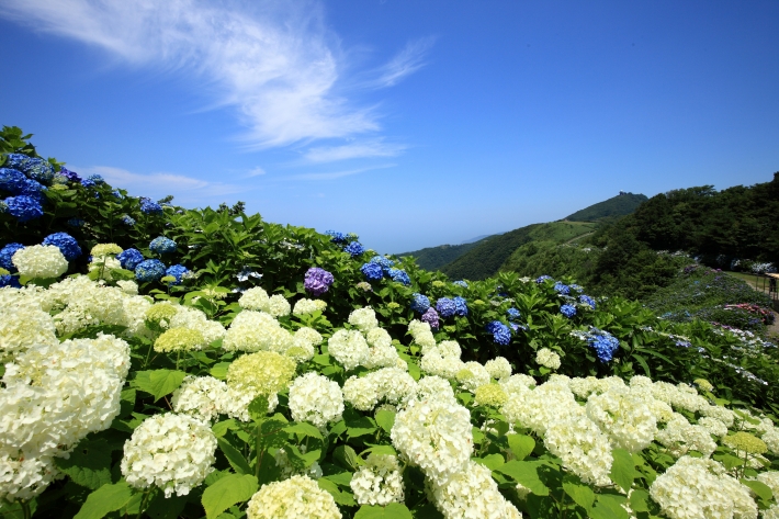 弥彦山ロープウェイの降車付近は紫陽花でいっぱいです 平場から遅れて開花の時期を迎え 空にも近いこの場所はいいですよ~