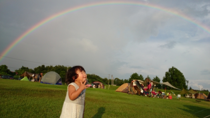 キャンプ場で雷雨の後にキレイな虹が…!しばらくして2つ目の虹も現れました。