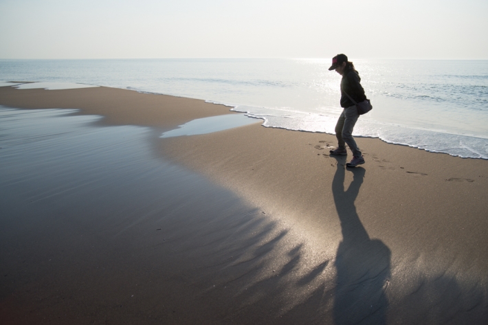 山からの小さな流れが海に注ぐあたりの砂浜は、波との相互作用で日々変化する。