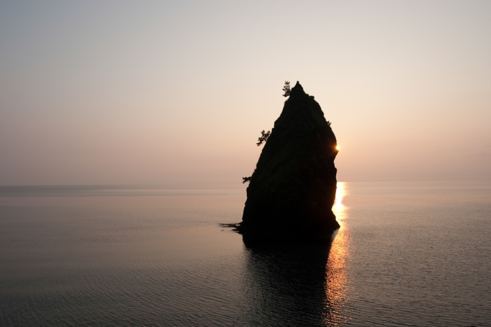 七浦海岸のシンボル的存在でもある立岩の夕景。何枚もシャッターを切り続けた。