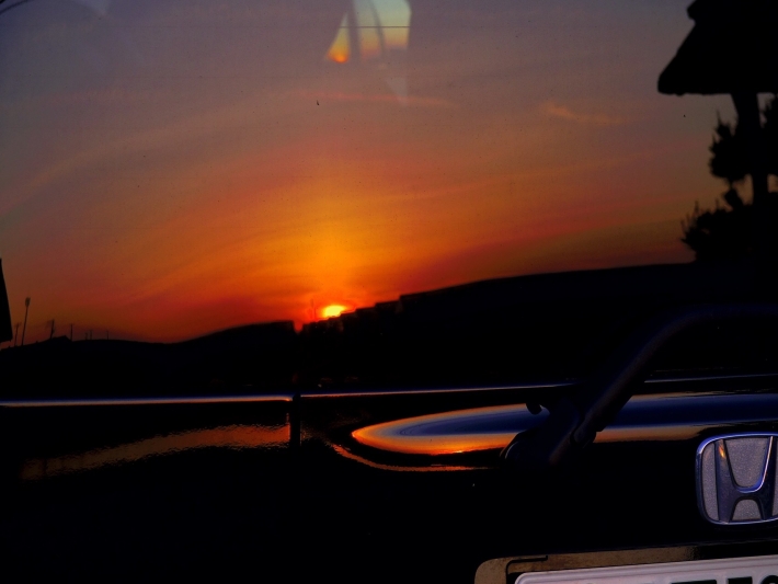 車のリヤウインドウに映る夕日が綺麗でした!