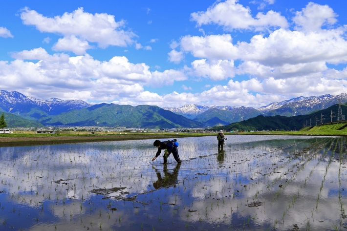 まだ山に雪が残る五月の中旬、南魚沼市では田植えがピークを迎えます。 機械で植えた後の補植作業は大切な作業の一つです。