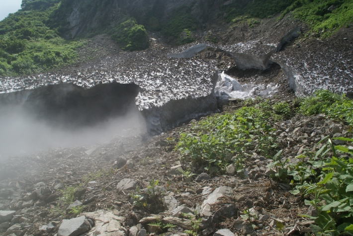 糸魚川の権現岳中腹には万年雪があります。標高は530mしかなく,このような低標高にある万年雪は全国的にも珍しいものです。現地までは舗装道路がありますので誰でも簡単に行くことができ,この点も全国的に例のないものです。現時点の万年雪の量は4500立方メートルです。万年雪の2つのブロックの間には美しい”橋”があったり,雪洞からは冷気が吹き出していたり,夏でも涼しい観光スポットとして,最近人気が高くなっています。