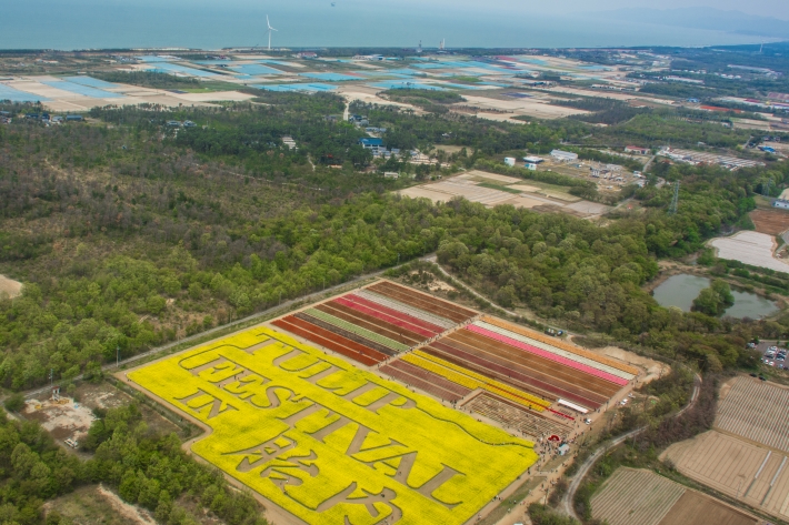 胎内のチューリップ会場で 初めてヘリコプターに乗って、上空から撮影してみました。怖いやら楽しいやらで 貴重な経験でした。
