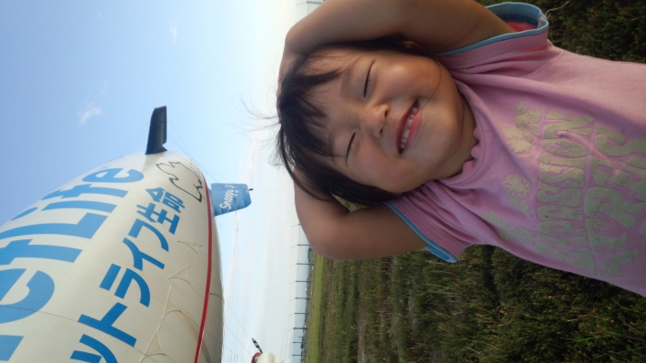 家の近くに、飛行船が来たので、家族で見に行きました。キーホルダーをもらって三女はとてもうれしそうでした。