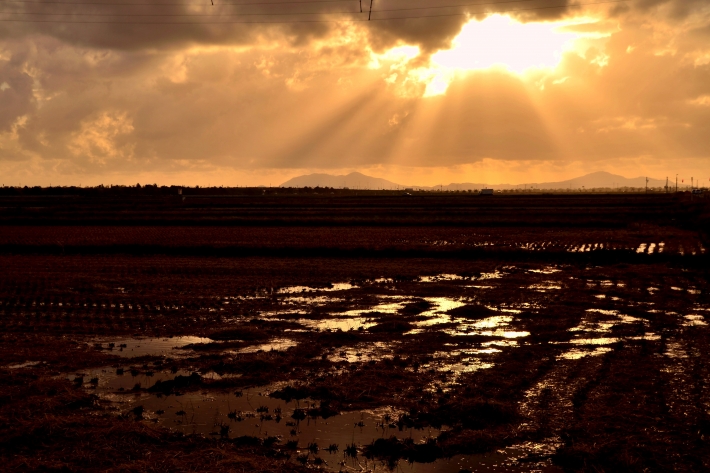 稲刈りの終わった秋葉区の田んぼと、遠くに写る弥彦山、角田山