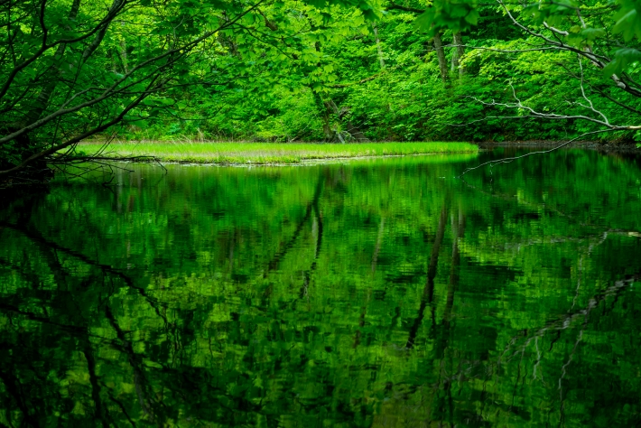 辺り一面が新緑に覆われ、池に映り込んだ緑がなんとも癒されます。
