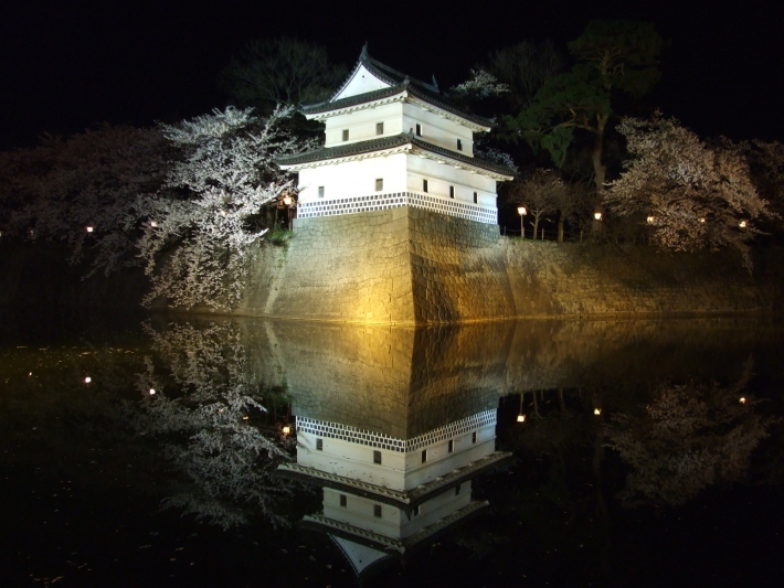 ライトアップされた桜満開の新発田城が、お堀の水鏡に写り、とてもいい感じで撮れました。