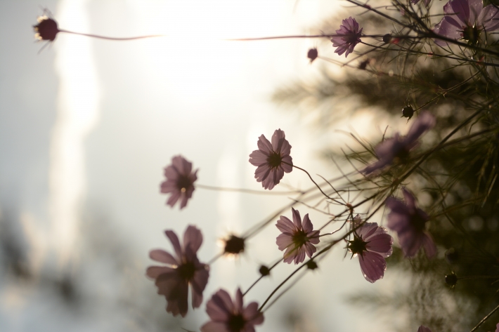雨あがりの朝、空き地に咲く秋桜の、けな気な姿に、ついシャッターを切りました、朝日を浴びる姿は…可愛らしくも…