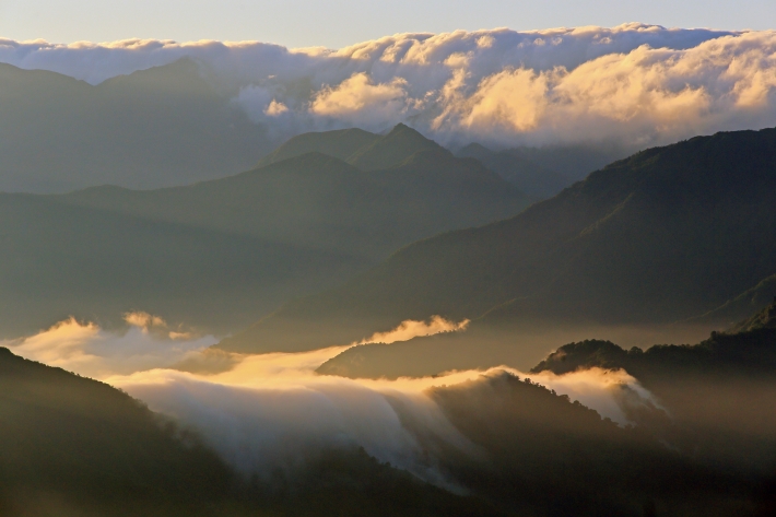 巻機山と坂戸山に滝雲がかかり、幻想的な景観を作り出しました。 山並みと盆地の地形が生み出す秋の風景です。
