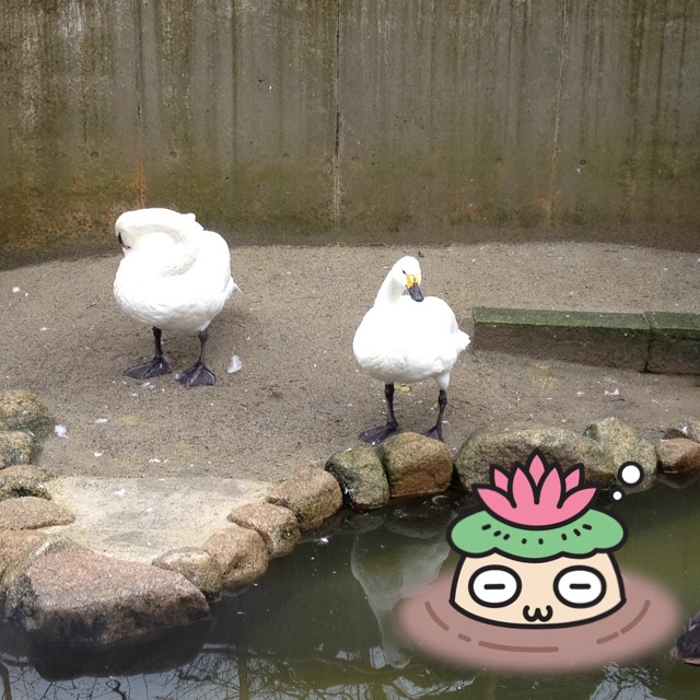 初雪の予報を前にした小春日和の昼下がり、悠久山の小動物園でゆったりと羽を手入れする白鳥たちと「なかのん」ののんびりした感じがぴったりだと思いキャラカメラで撮りました。
