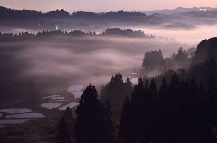 夕方星空を撮ろうと棚田が見渡せるところで準備していたら霧が湧き出し、満月に照らされた風景が広がりました。