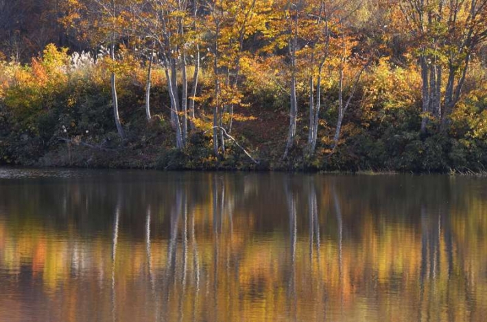 大厳寺高原入り口にたどり着くと、西日を浴びた樹々が綺麗な姿を池に映していました。
