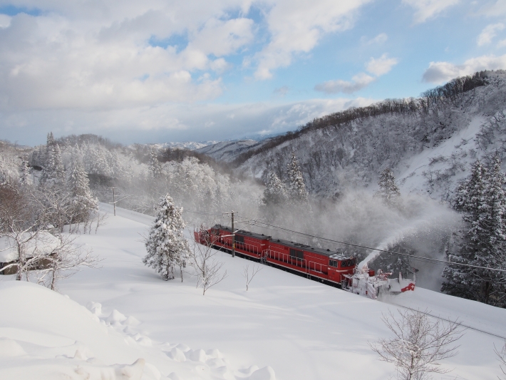 線路の脇に寄せた雪を、力いっぱい谷底へ飛ばす機関車