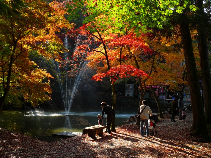 加茂山公園です。噴水と紅葉が光に照らされて輝いていました。