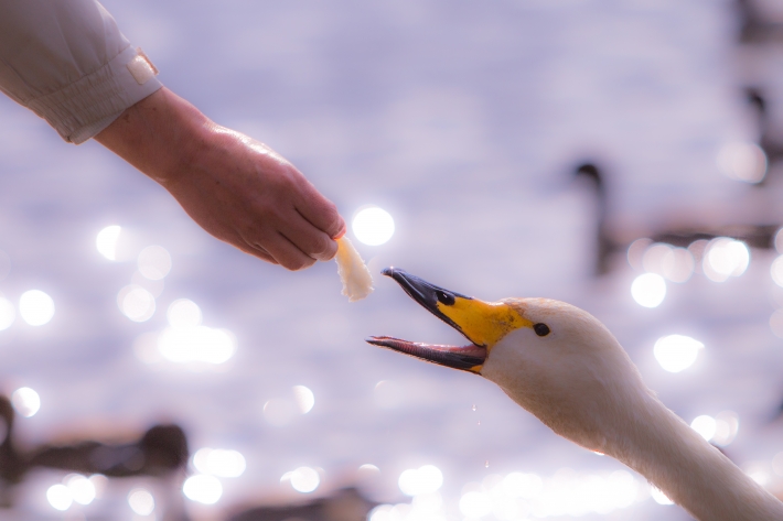 お腹をすかせている白鳥は自ら人に寄って来てエサを欲しがっています。