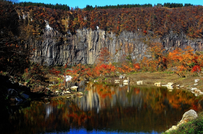 秋山郷 紅葉の石落し岩