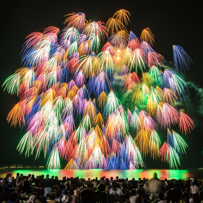 夜の海上に打ちあがる、ぎおん柏崎まつりの大花火大会の写真です。
