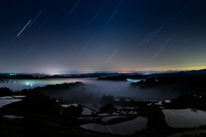 雲ひとつない星空の下、棚田の水鏡に映りこみ星がキレイな夜でした。