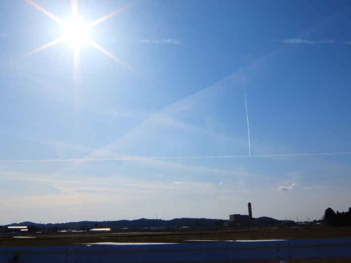 冬の爽やかな晴れ間の空に飛行機雲で落書きされた様でした♪