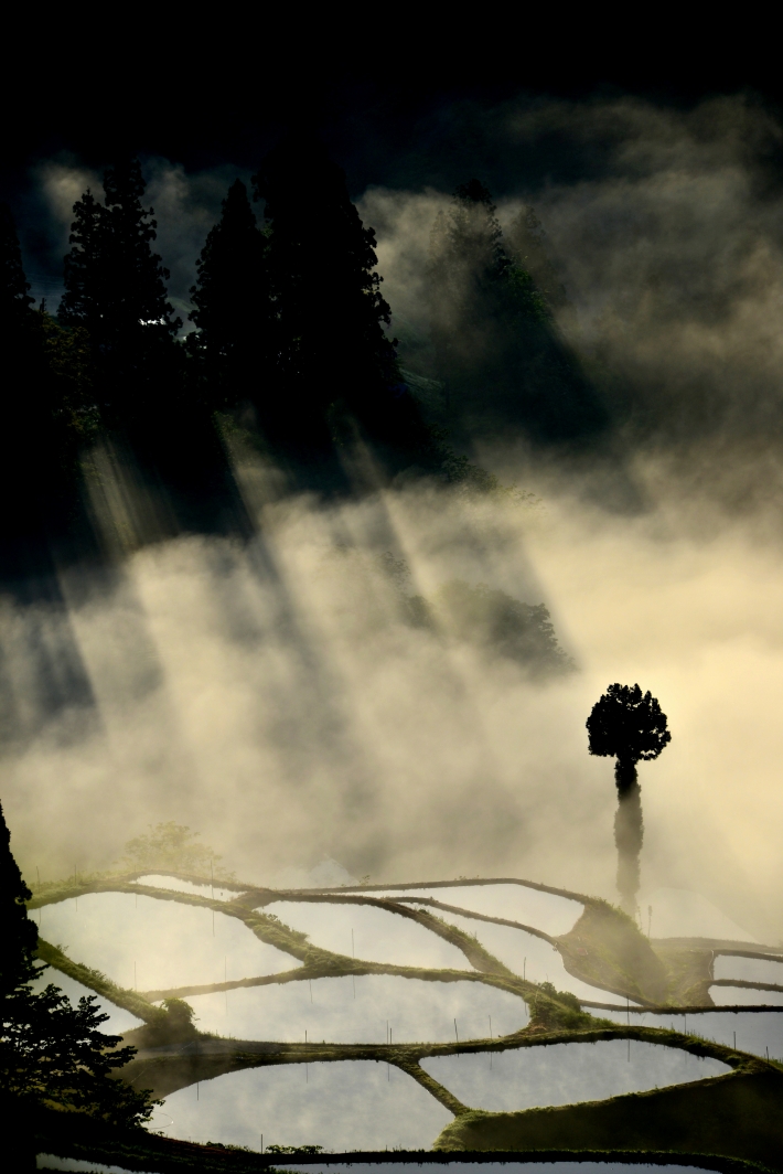 山古志の棚田に霧が出て朝日が射し幻想的な風景になりました。